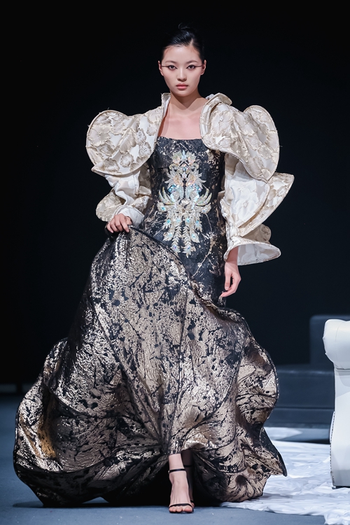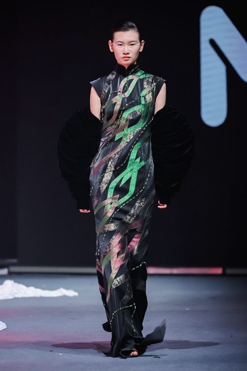 本場秀匯聚52位青年設(shè)計師的120套作品,通過模糊傳統(tǒng)與現(xiàn)代的邊界,構(gòu)建出時間感懸置的沉浸式空間。舞臺中央層疊的輕紗裝置隨漸變光線流轉(zhuǎn),從冷白、深黑到暖黃的光色演變,隱喻著從文化覺醒到未來探索的四重敘事。北服時裝周組委會特別設(shè)置產(chǎn)教融合簽約環(huán)節(jié),十余家企業(yè)現(xiàn)場與畢業(yè)生達成合作意向,彰顯作品的藝術(shù)價值與產(chǎn)業(yè)潛力。本場秀演均由時尚傳播學院表演專業(yè)學生進行演繹并參與編導(dǎo)。