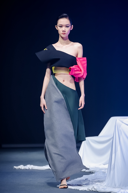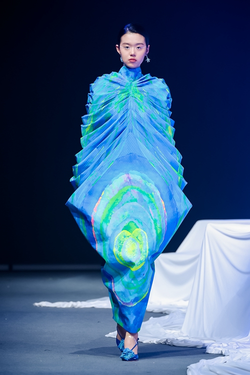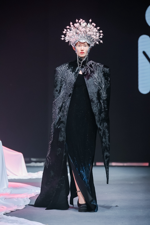 "未"作為生長容器核心理念貫穿全場,舞臺通過非對稱幾何結(jié)構(gòu)與參數(shù)化燈光系統(tǒng),創(chuàng)造出虛實交織的場域。冷調(diào)藍白光效中懸浮的立體剪裁作品,與黑色篇章里剛?cè)岵臋C能風設(shè)計形成戲劇張力,在低飽和度暖光中定格為開放式的未完成狀態(tài),完整呈現(xiàn)"從解構(gòu)到重構(gòu)"的設(shè)計哲學。