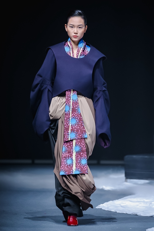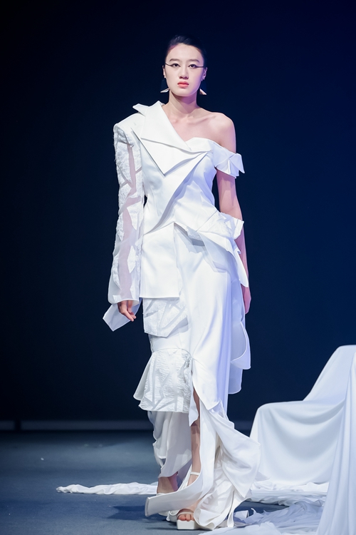 以藍白極簡主義開篇,設(shè)計師通過水溶刺繡工藝解構(gòu)傳統(tǒng)漢服交領(lǐng),將東方形制轉(zhuǎn)化為當代建筑感廓形,冷調(diào)光線中浮動的絲質(zhì)面料折射出新生代的審美覺醒。