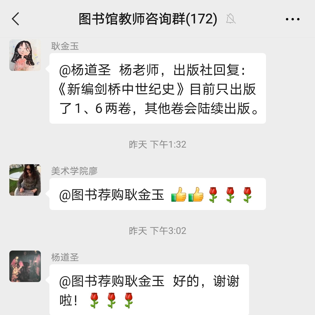 為暢通讀者反饋渠道,及時解決讀者問題,切實提升讀者咨詢反饋時效,圖書館除利用面對面、電話、郵件、問卷調查等方式外,著力加強微信群咨詢服務工作。目前已開通微信咨詢群6個,直接服務師生近1400人,形成7*12小時在線參考咨詢服務制度,逐步搭建起一支具有較高信息素養、相關專業知識以及良好服務意識的咨詢館員隊伍,切實做到“接訴即辦,有詢必應”,實時解決讀者問題,傾聽讀者聲音。