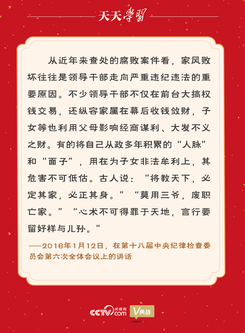 習近平總書記多次引經據典,要求各級領導干部帶頭抓好家風、廣大家庭弘揚優良家風,中央廣播電視總臺央視網《天天學習》特擷取其中經典語句,與您一起學習領悟。