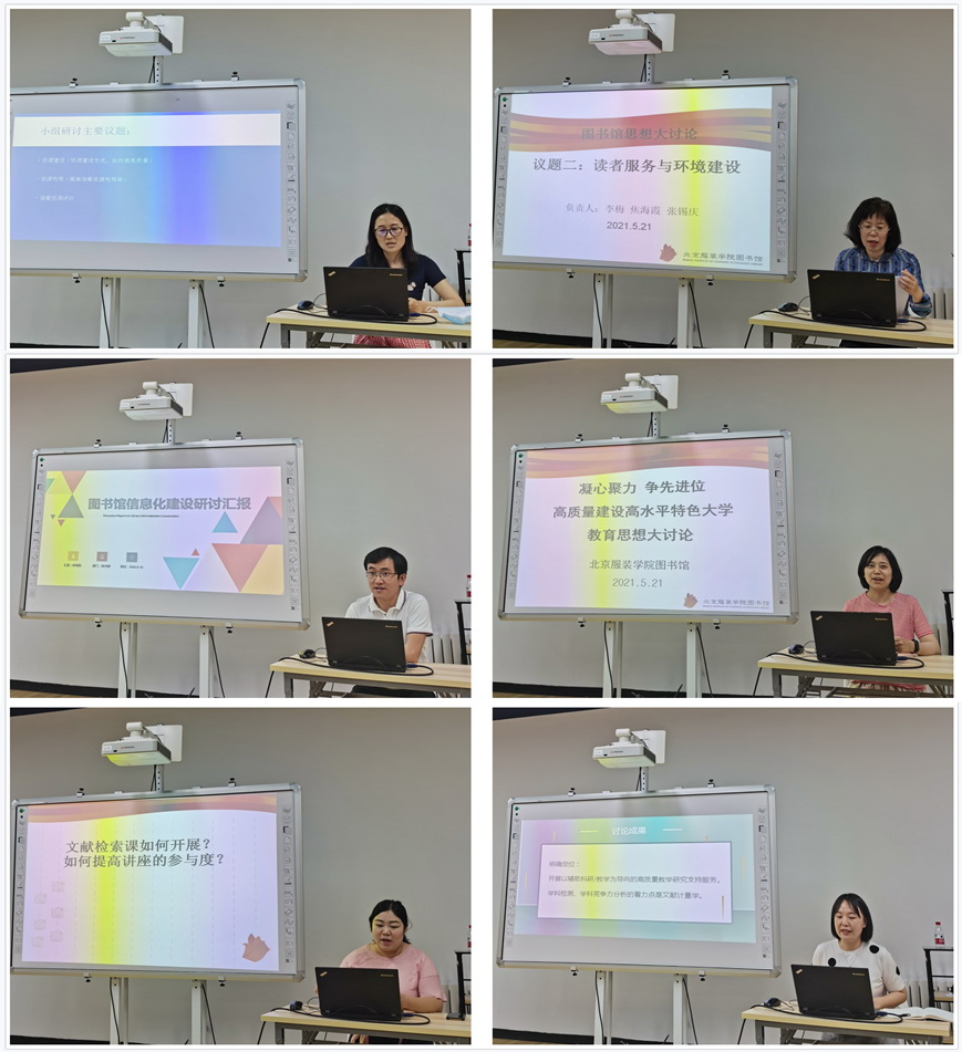在本次全館集中研討會上,首先由各研討小組負責人分別以圖書館文獻資源建設、讀者服務與環境建設、信息化建設、特色資源建設與用戶教育、教學研究支持服務、讀者活動為主題,將小組研討形成的圖書館業務工作問題總結與分析、解決方案與改進措施、未來規劃與展望等成果進行了詳細匯報,并就部分問題和與會館領導及館員們進行了深入的探討。