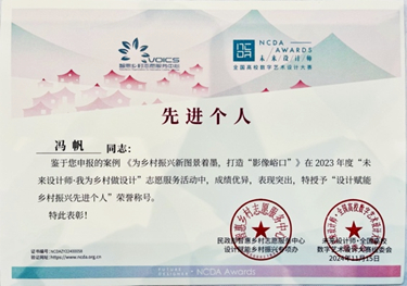 學院形成了價值塑造、知識傳授和能力培養三位一體的課程思政貫通培養體系,以價值傳播為己任,讓學生在鄉村振興、文旅傳播、城市更新、非遺傳承等社會主義現代化建設的一線陣地上,成長為有思想的內容創作者和傳播者。攝影系馮帆老師“以實踐課程為平臺助力鄉村振興,打造影像峪口”的教學實踐案例獲得由民政部聯合舉辦的第二屆“全國高校設計賦能鄉村振興創新案例”國家級優秀案例獎,馮帆老師榮獲“設計賦能鄉村振興先進個人”榮譽稱號。