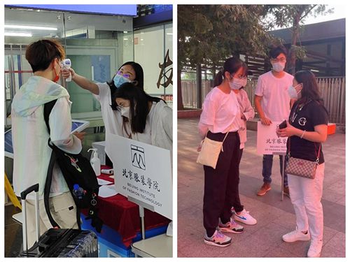 天通苑地鐵北站的志愿者們在為同學們測體溫