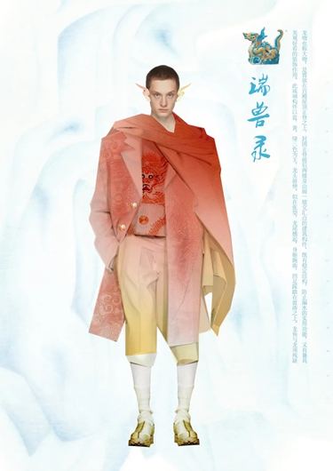 研一上學期,陳旭展在恭王府博物館接觸到實物龍袍和清代織錦繡技藝,導師王羿詳細耐心的講解讓他獲得很多服飾方面知識,這是他與中軸線上服飾文化的“初次會面”。在“清代染織繡”拍賣專場,得以近距離觀看清代織物以及服裝服飾實物,陳旭展深入領會有關文化并在比賽中踐行理論與設計相結合的理念。“也感謝王薇老師組織服裝服飾子賽道服裝組的作品征集工作,有機會讓設計師在中軸線賽道上綻放光彩。”陳旭展談到,老師們的無私幫助,使他擁有了源源不竭的前進力量。