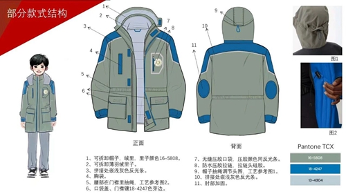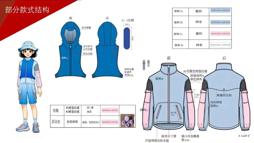 戶外裝則體現了海淀區作為科技創新前沿陣地的特色,將科技元素融入運動健身服裝。以藍色和白色為主色調,采用吸濕排汗、防曬抗UV、防風雨高性能面輔料,以及環保充氣工藝,提高運動性能和穿著舒適度,傳達可持續發展理念。