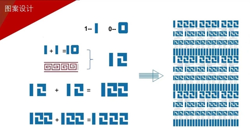 中國古典哲學中的“陰”與“陽”“有”“無”,似乎都與數學思想——二進制有著千絲萬縷的聯系。本系列制式服裝以芯片工作原理為靈感,將二進制運算與中國傳統紋樣回紋相結合發展裝飾圖案,并以象征科技、創新和未來的藍色為主色調進行各品類設計。