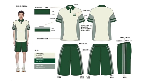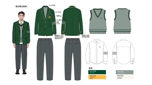 靈感來源于海淀區“春水澹冶而如笑,夏園蒼翠而如滴;秋林盡染而如妝,冬城素裹而如睡”的生活環境。以“健康、和諧、時尚、活力”為設計理念,結合學生蓬勃向上、如后浪般活潑勇敢,不斷追逐和探索美好事物的精神,同時融入當代流行元素開展設計。配色以松綠、漢白為主,搭配灰綠、第戎黃,給人清新大方的感覺。款式上簡潔美觀,滿足學生日常需求,展現校園文化,體現出海淀區“生態優美、和諧宜居”與學生的健康活力。