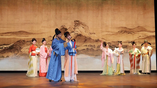 服裝秀開場前,四名志愿者身著唐代復原服飾,賓客近距離欣賞傳統服飾工藝,在形制、色彩、紋樣中體會傳統服飾文化之美;結合現場互動環節,增強賓客參與感、體驗感,使其沉浸于敦煌文化的獨特魅力之中。