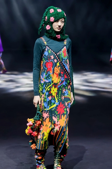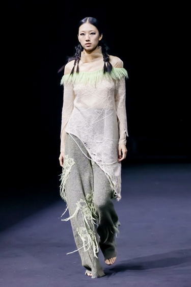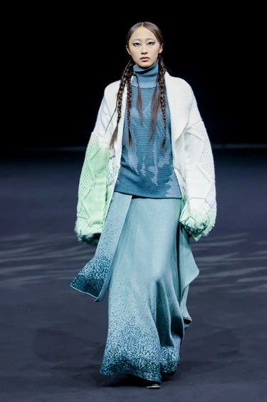 第二幕中,開場走來的純真孩童與充滿自然之美的針織設(shè)計(jì)相得益彰,“行循自然”的設(shè)計(jì)理念將人與自然緊密關(guān)聯(lián)。