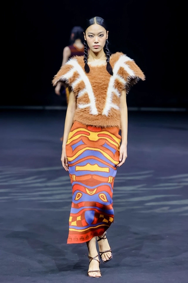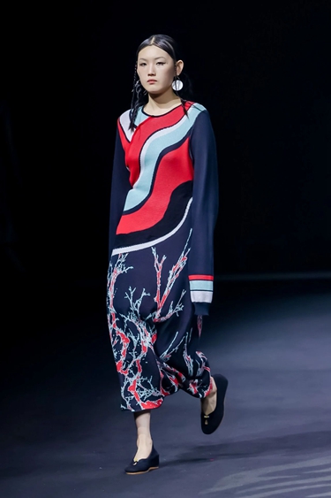 展演分為三幕。第一幕由激情的傣族鼓舞表演開場,充滿民族風(fēng)情的設(shè)計(jì)既是對傳統(tǒng)文化的傳承,也體現(xiàn)了對未來的期許。針織串聯(lián)歷史、編織未來。