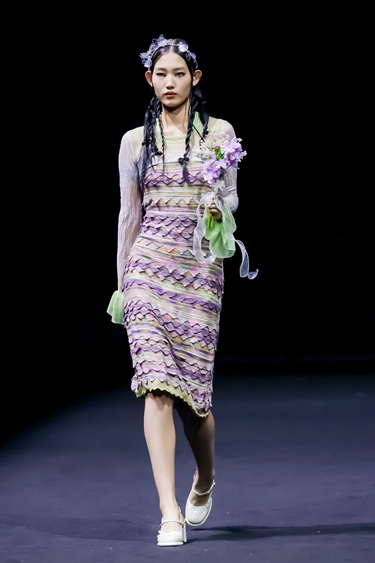 本次秀場編導(dǎo)、時(shí)尚傳播學(xué)院2021級服裝表演專業(yè)陳詩洋表示,在秀演策劃過程中,團(tuán)隊(duì)成員緊密協(xié)作,每個(gè)人的創(chuàng)造力得到挖掘,對于自己來說是理論與實(shí)踐相結(jié)合的重要體驗(yàn)?!俺两健蔽枧_設(shè)計(jì)助力觀者更加深入直觀地體驗(yàn)針織服裝設(shè)計(jì)之美。