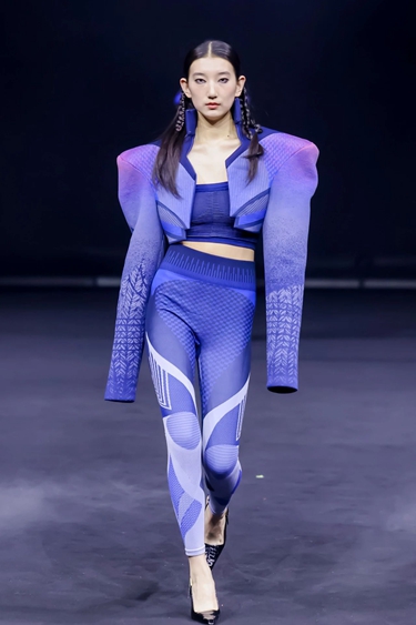 劉玲的作品“自己”把目光聚焦于女性。采用無縫一體織技術(shù),在不斷嘗試中模擬皮膚線條和建筑廓形,并與女性身體相融合,結(jié)合人體結(jié)構(gòu)和皮膚拉伸進(jìn)行創(chuàng)意設(shè)計(jì),彰顯女性力量。