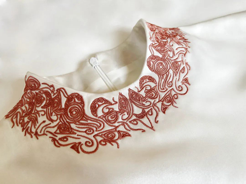 禮服上刺繡的顏色,取自良渚古城出土的大量陶器的彩繪色——陶繪紅。陶繪紅屬于良渚色彩中的赤紅色系,在良渚文明中顯得尤為特別,它來自良渚的紅陶、彩繪陶,以燒制、繪制、涂裝鑲嵌形成的瑰麗色彩,證明著良渚人對色彩美的追求,也印證著跨越五千年的中華美學傳承。