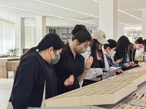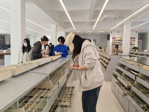 輔料是產品設計中重要的部分,海寧產業園老師帶領學生認真調研海寧皮革城面輔料市場,為創作方案挑選適合的輔料配件。