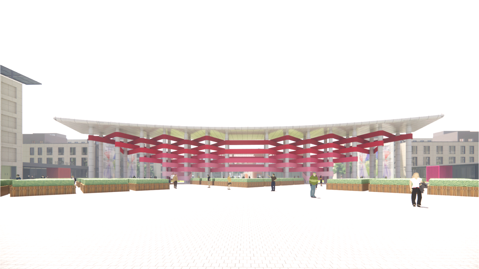 設計說明:以編織再現傳統建筑梁架法式,構建時尚與教育的交織、科技與傳統的對話以及學校和通州區的文化聯結。