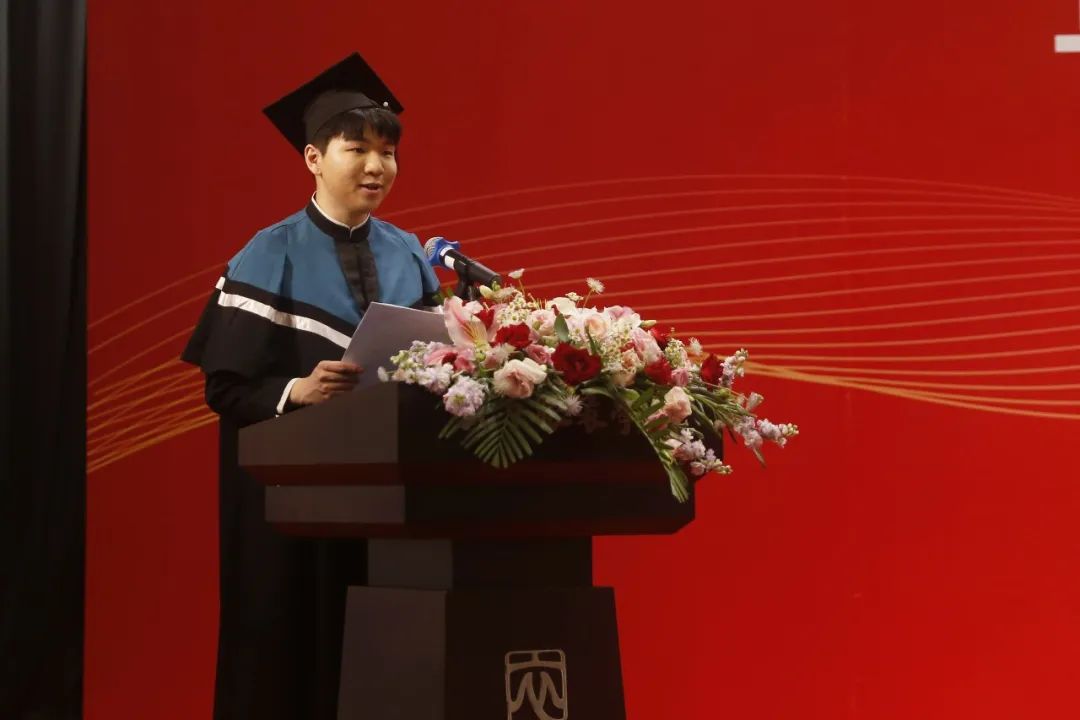 商學院田明鑫同學代表全體畢業生發言。從入學時的喜悅興奮到畢業時的依戀不舍,他回顧了四年來的學習成長經歷。因為疫情雖無法和同學們相聚在校園,但此刻的“云上”相聚也同樣彌足珍貴。他感謝母校給予同學們成長舞臺、前行力量和堅定信念,未來也將迎難而上、腳踏實地、篤定前行,為實現中華民族偉大復興的中國夢貢獻青春力量。