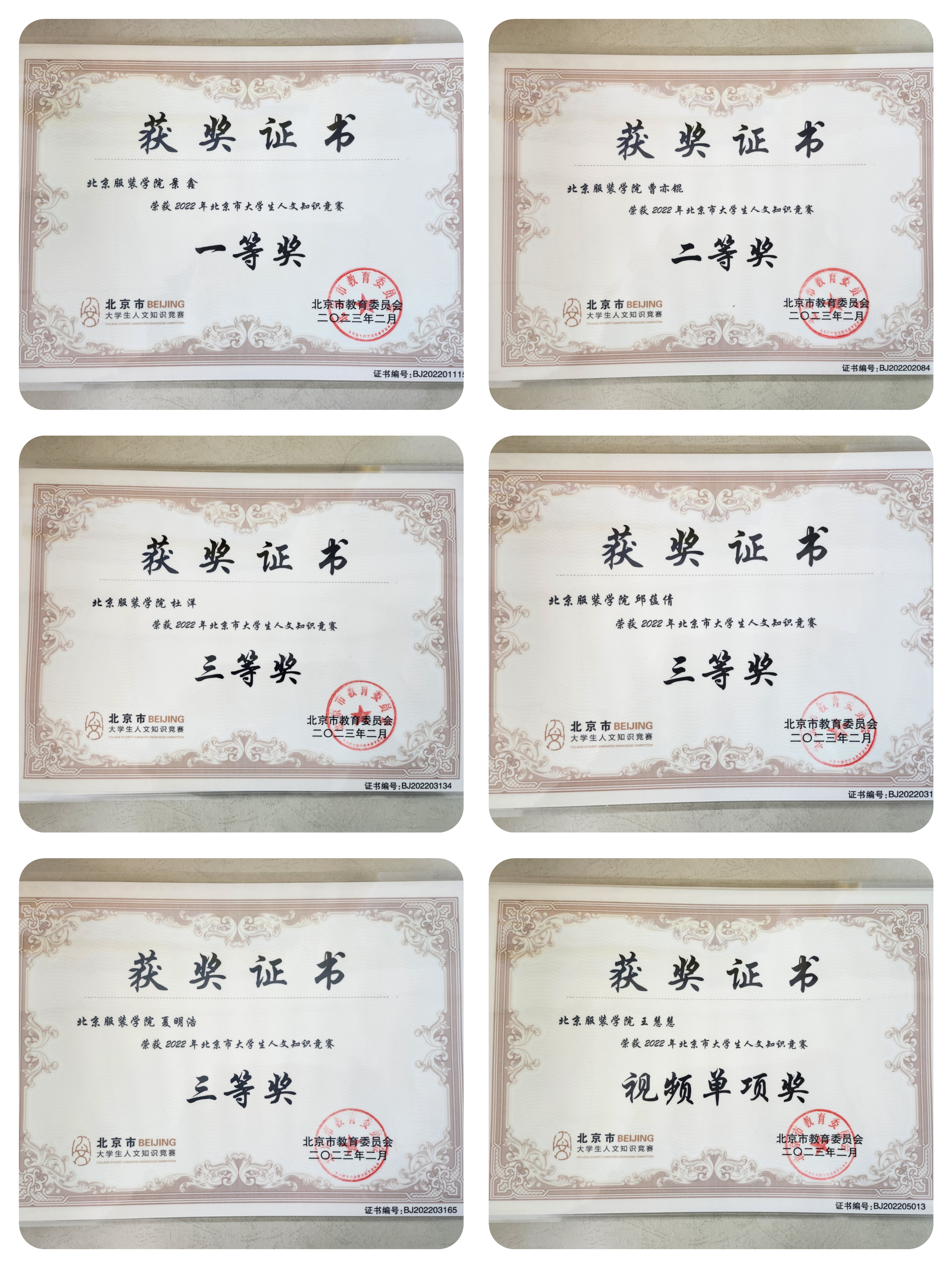 大學生人文知識競賽現場及北京市獲獎證書(部分)