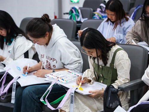 在現(xiàn)場,李棟老師用豐富示例,介紹了幾種主要手繪包創(chuàng)作手法,為同學們打開思路。隨后,又結(jié)合定向征集的作品,進行現(xiàn)場點評。在李棟老師鼓勵下,學生們展開大膽創(chuàng)作,為再生環(huán)保包增添更多青春氣息與時尚感。