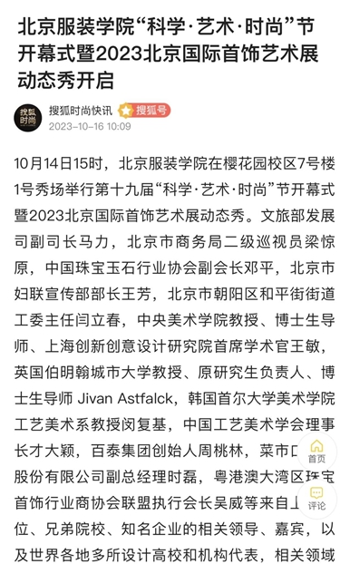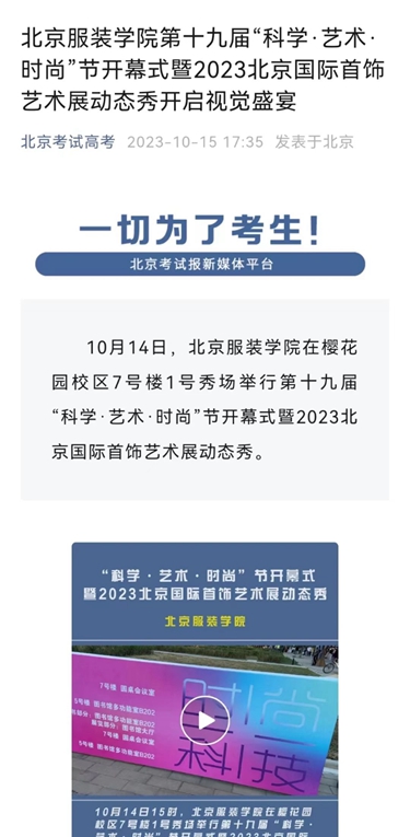 北京考試報視頻號10月15日播出《北京服裝學院第十九屆“科學·藝術·時尚”節開幕式暨2023北京國際首飾藝術展動態秀開啟視覺盛宴》