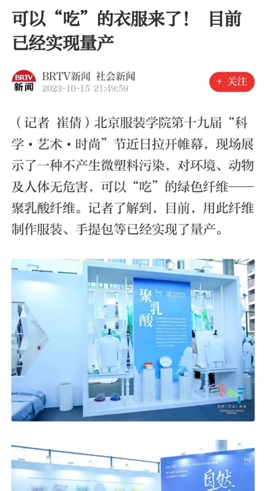 “中國教育新聞聯播”10月17日播出《科技助力雙碳目標 可以“吃”的服裝材料亮相高校時尚節》