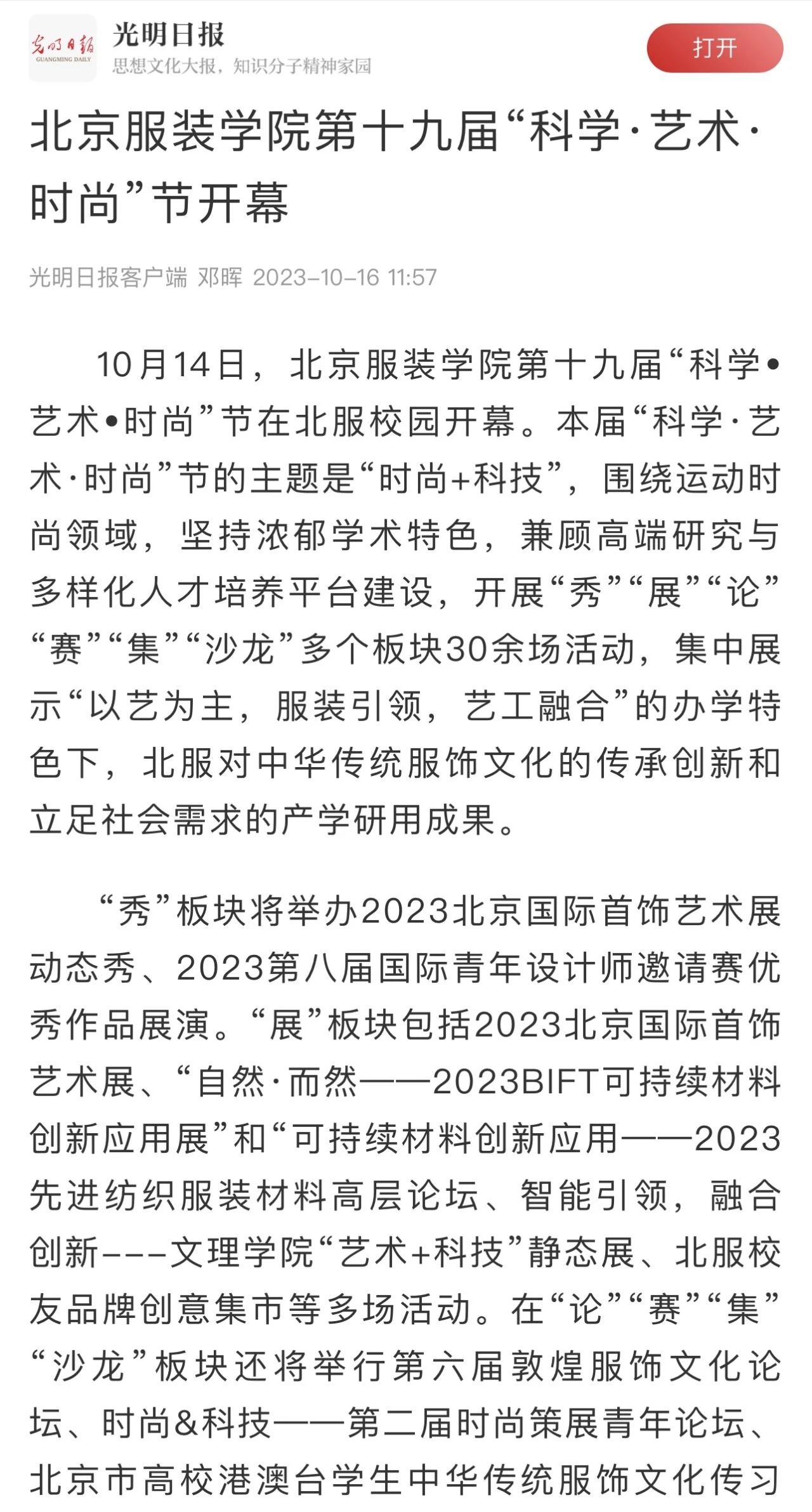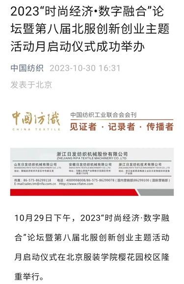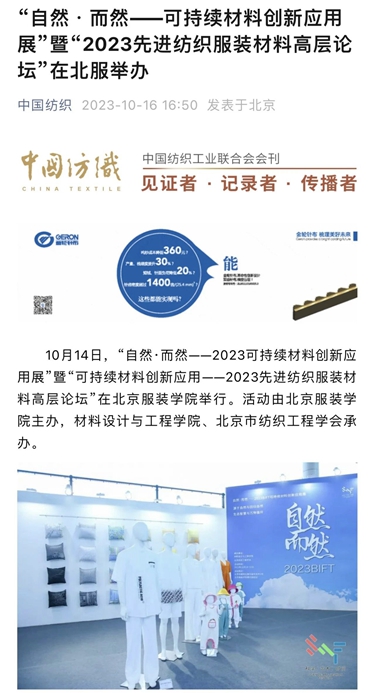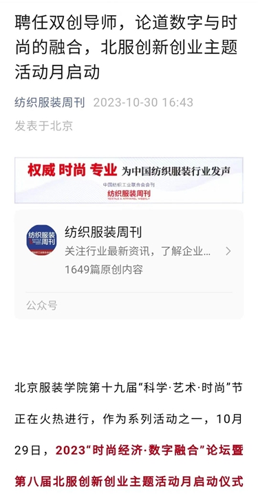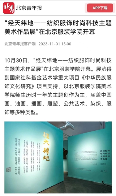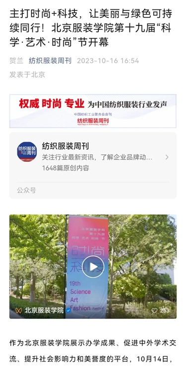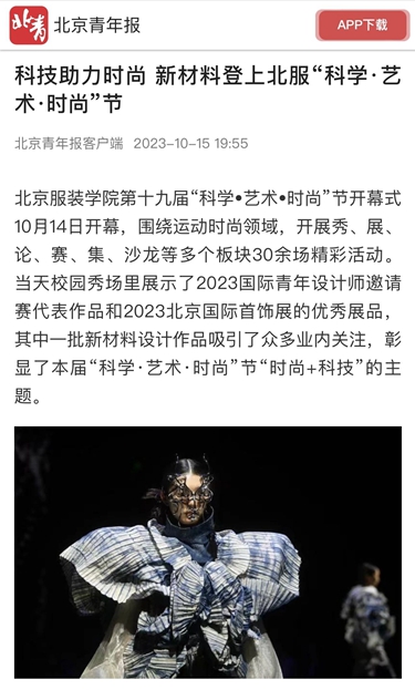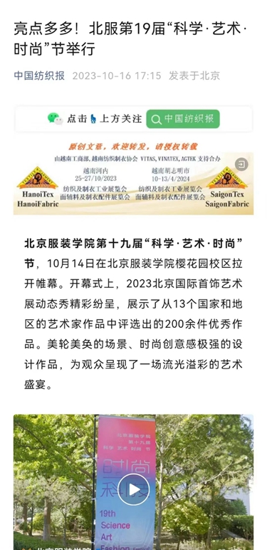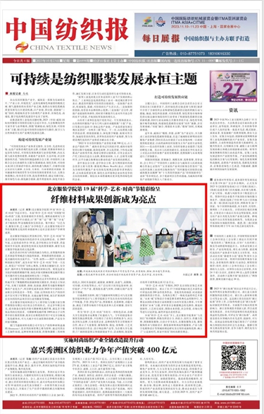 中國紡織報頭版10月23日刊發《北京服裝學院第19屆“科學·藝術·時尚”節精彩紛呈 纖維材料成果創新成為亮點》