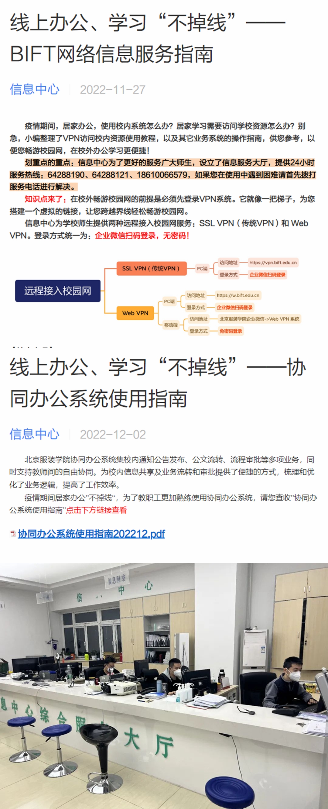 信息中心充分運用信息化手段,助力學校常態化疫情防控管理。實現了北京健康寶與校內疫情防控系統對接,構建了精準的師生基礎數據臺賬,在各樓宇等重點部位安裝刷臉設備,為疫情流調提供數據支撐。信息服務大廳為師生訪問學校資源提供24小時服務,協同辦公系統為校內信息共享及業務流轉提供了便捷。
