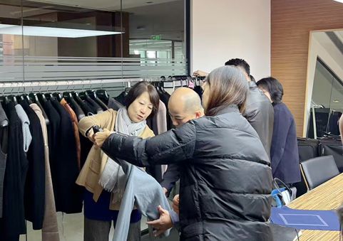 雙方在現場就紗線開發創新、織物組織工藝研發成果進行交流,深入探討成衣設計創新點、市場可行性及后續延展設計的思路和方法。