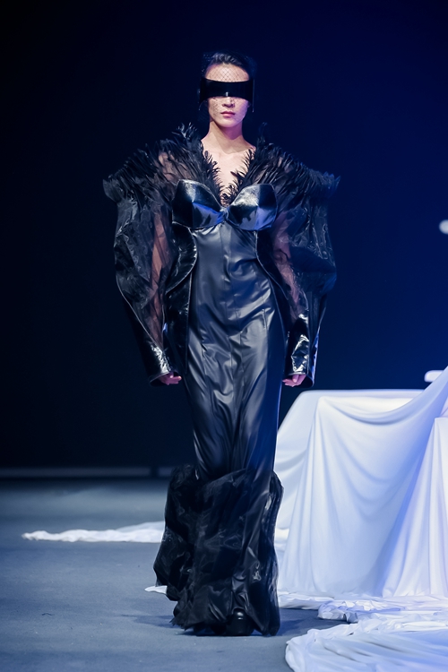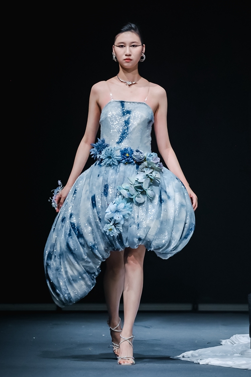 以藍白極簡主義開篇,設計師通過水溶刺繡工藝解構傳統漢服交領,將東方形制轉化為當代建筑感廓形,冷調光線中浮動的絲質面料折射出新生代的審美覺醒。