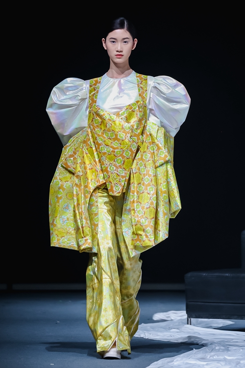 終章以參數化印花與生物基材質的創新組合收尾,漸變光效中流動的數字化紋樣,與植物染工藝的精準色彩控制形成技術對話,構建出開放式的未來時尚圖景。