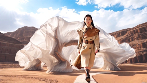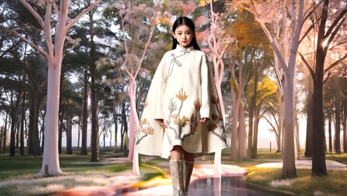 “元織界”以“城市森林”為視覺母題,AI自動生成山林光影、肌理動態與生態構圖,表達對人類與自然關系的深層關懷,呼應可持續時尚理念。