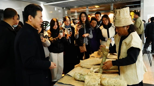 展覽現場,苗族傳統刺繡傳承人廖力耕、哈尼族樹皮制作技藝傳承人張衛平進行了非遺展演,生動展示了非遺服飾制作技藝,讓觀者深切感受到民族相通共融的生活智慧與審美情趣,為展覽增添了濃墨重彩的一筆。