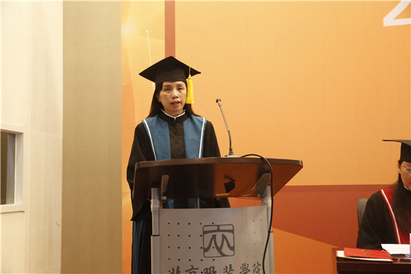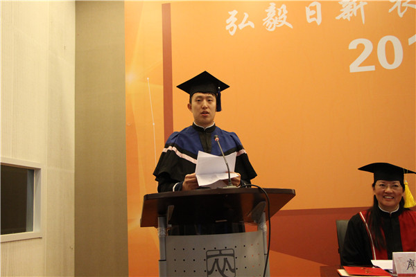 造型藝術(shù)系研究生金大朝同學(xué)代表全體畢業(yè)研究生發(fā)言,抒發(fā)了對(duì)母校的熱愛(ài)和依依不舍之情,并表示在畢業(yè)后將繼續(xù)堅(jiān)持北服學(xué)子的理想信念,以飽滿的熱情和嶄新的姿態(tài),投身社會(huì)、奉獻(xiàn)青春、做出貢獻(xiàn),腳踏實(shí)地走好每一步。隨后,全體2016屆畢業(yè)生在金大朝同學(xué)的帶領(lǐng)下,齊聲宣讀2016屆畢業(yè)誓詞,表達(dá)畢業(yè)生對(duì)母校的眷戀和對(duì)貢獻(xiàn)社會(huì)的決心。