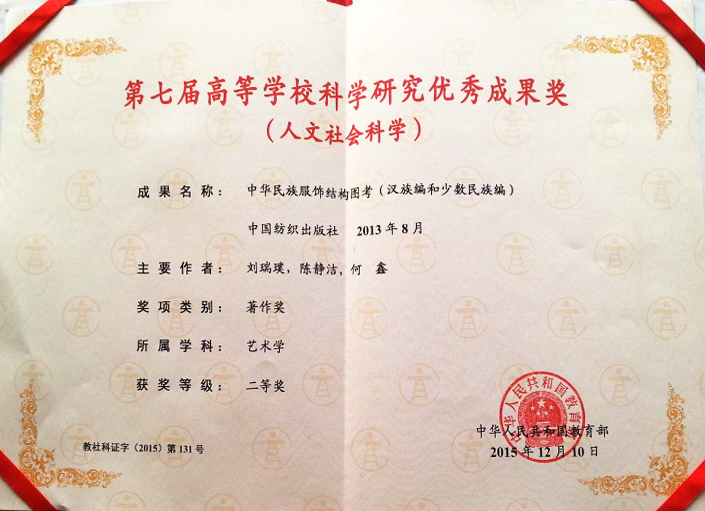 【新聞中心訊】近日,由我校劉瑞璞教授主編的《中華民族服飾結構圖考》漢族編和少數民族編的學術專著(國家出版基金項目、2014年度中國紡織工業聯合會優秀出版物一等獎),榮獲中華人民共和國教育部頒發的“第七屆高等學校科學研究優秀成果(人文社會科學)二等獎”。并被收錄在教育部獎勵委員會擬編輯出版的《第七屆高等學校科學研究優秀成果(人文社會科學)獲獎成果簡介》中。