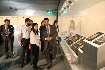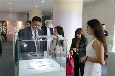 巴基斯坦旁遮普省工業(yè)地產(chǎn)開發(fā)管理有限公司主席Malik Tahir Javed(馬利克·塔希爾·賈伍德)和巴基斯坦駐華大使館商務(wù)參贊阿爾法博士一行首先參觀了民族服飾博物館和藝術(shù)設(shè)計(jì)學(xué)院2016屆本科生畢業(yè)作品展的珠寶與首飾設(shè)計(jì)、紡織品設(shè)計(jì)等作品展區(qū)。