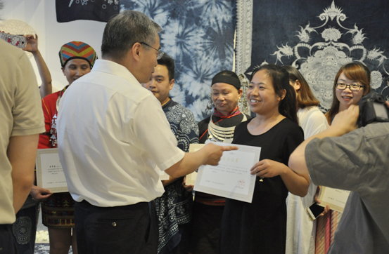 【新聞中心訊】6月19日,由文化部教育部主辦、北京服裝學院承辦的中國非物質文化遺產傳承人群民族服飾制作技藝、傳統印染技藝研修班結業成果展在藝術樓舉行。文化部副部長項兆倫出席結業展并為39名學員逐一頒發結業證書,文化部非遺司巡視員馬盛德、中國婦女兒童博物館館長楊源、中國手藝網總裁常會學,我校領導馬勝杰、劉元風、倪賽力等陪同參觀。