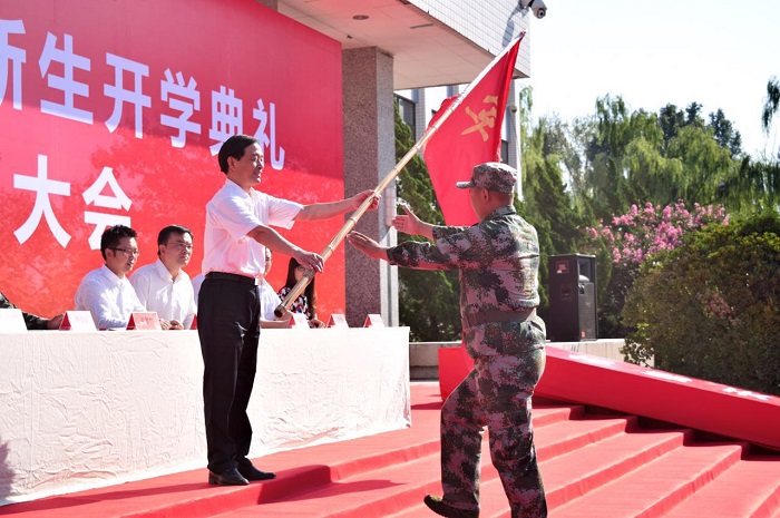 開學典禮后,新生軍訓動員大會隆重舉行。黨委副書記倪賽力、承訓團團長李保華,校軍訓工作領導小組成員以及全體教官、2016級新生出席了大會。在雄壯的中國人民解放軍軍歌后,倪賽力副書記為軍訓連隊授旗。為期兩周的軍訓正式拉開帷幕。