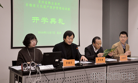 【新聞中心訊】11月7日,貴州省黔東南州非物質文化遺產保護管理培訓班開學典禮在北京服裝學院科技報告廳舉行。北京服裝學院副院長賈榮林,貴州省黔東南州文化廣電新聞出版局局長范鐘聲,我校教務處、圖書館、繼續教育學院負責人及來自貴州省黔東南16個縣市的54名非遺管理干部參加。