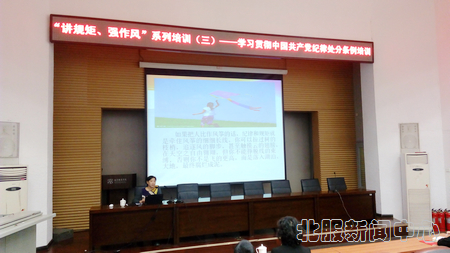 【新聞中心訊】11月24日下午,“講規矩、強作風”系列第三講在我校科技報告廳舉行。我校邀請北京市紀委監察局案件審理室副主任楊琦同志為廣大黨員干部做學習貫徹《中國共產黨紀律處分條例》培訓,中層干部和機關黨總支黨員近百名教職員工參加了培訓,黨委副書記艾麗全程參會,紀委書記蔣達峰主持培訓。