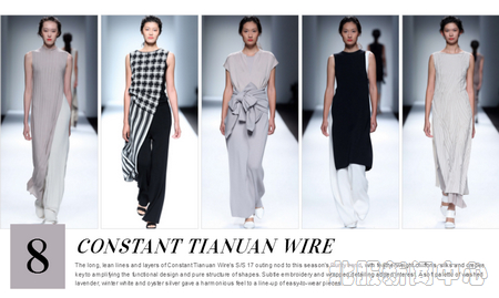 【新聞中心訊】近日,2017春夏上海時裝周舉行,其中有9場大秀被全球時尚網站WGSN評選作為本季最佳。由郭瑞萍教授參與設計的恒天纖維集團“元絲·一元復始”新品發布會(Constant Tian Yuan Wire),與Uma Wang、Deepmoss等知名品牌一同位列其中。在“元絲·一元復始”新品發布會中,柔順而具有光澤感的元絲在精巧的針織工藝之下呈現出高級的面料質感,輕盈自如的廓形款式體現著郭瑞萍教授一貫的簡約大氣的設計風格,成為本季時裝周中不容忽視的一場時髦大秀。