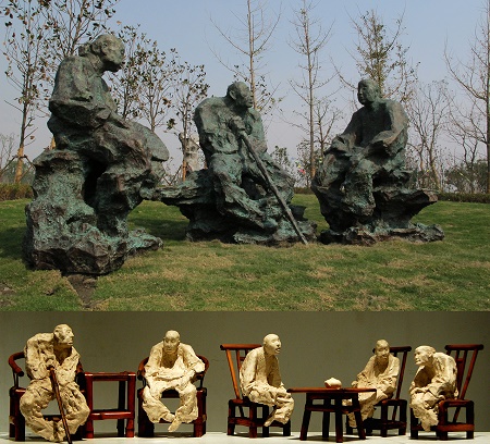 作品把人物年齡定位在71歲,即朱載堉完成《樂律全書》的年齡。人物身著長衫,頭包小包帕,腰系大帶,體現其“布衣王子”高風亮節的形象特征。雕塑中采用人物彈琴過程中左手飛燕頡頏、右手春鶯出谷的經典古琴手勢,展現了人物閉目仰頭的一瞬間。其彈奏的樂器正是他制造的第一架定音樂器——“均準”。雕塑創作以深遠、空寂為造型基調,在雕塑的空間里形成平遠之感,表達了時空深遠、詩意無限、大音希聲、怡淡浩然的抽象感受。雕塑底座是朱載堉創建的“十二平均律”所付諸的旋宮實踐,即樂律的“旋宮圖”,呈圓狀。這個圓也是中國文化中一個重要的精神外化,一種圓融的生命境界,一種浩瀚的宇宙意識,一種人與自然和諧中的詩性塑造和哲學思考。雕塑意在展現人物獨特的人文精神,以及超越于形體與材質之上的人文情懷。