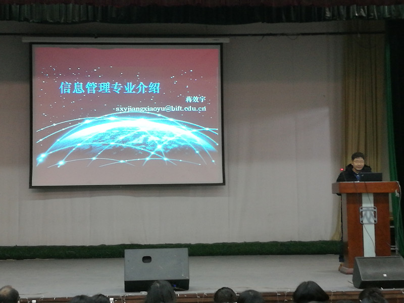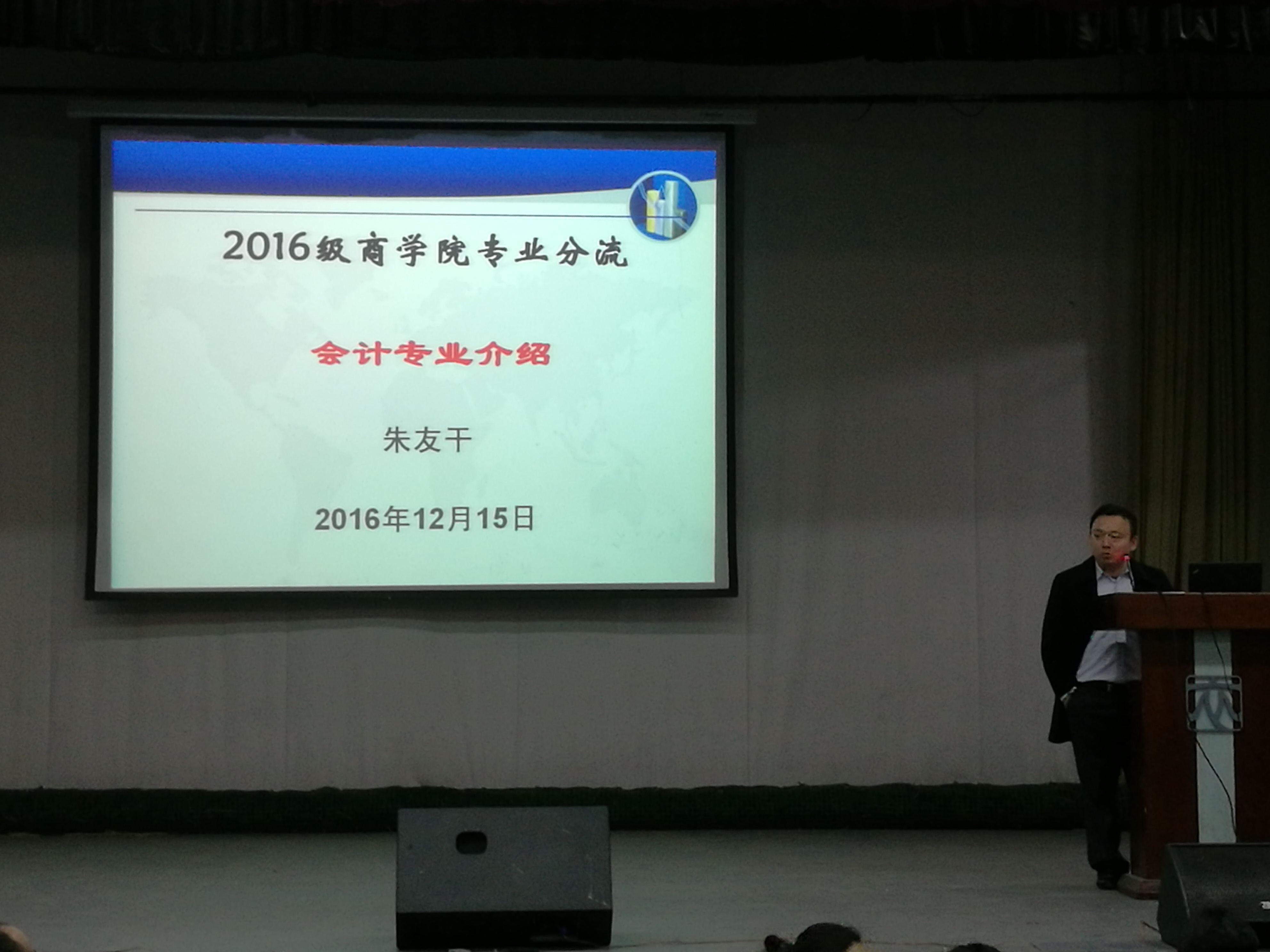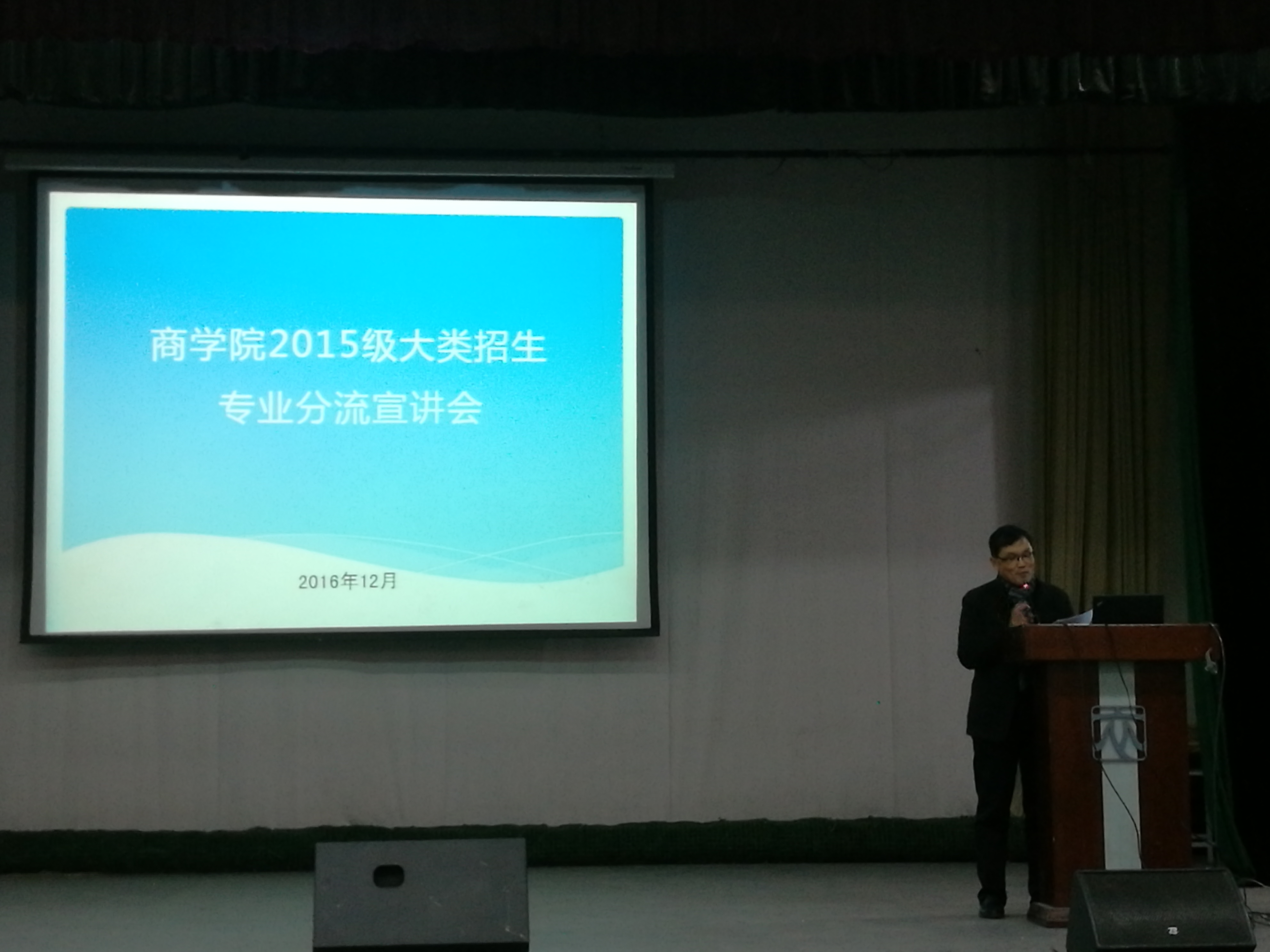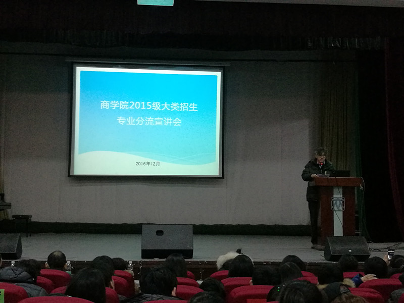 12月15日,2015級學生大類招生專業分流宣講動員會在北校區禮堂如期舉行。商學院院長李曉慧教授、黨委書記梁宇老師、副院長單紅忠副教授、姚蕾教授、黨委副書記尋梁老師以及各專業教研室老師們出席。單紅忠副院長系統介紹了分流方案和專業志愿填報要求,隨后五個教研室的老師們一一上臺各展所長,就本專業的培養特色和發展前景向同學們進行了精彩的介紹。會后,同學們又到教學樓預先安排好的教室向老師們現場咨詢請教。