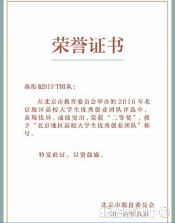 我校燕銜泥BIFT項目榮獲二等獎,此獎項是該團隊暨全國第二屆“互聯(lián)網(wǎng)+”大學生創(chuàng)新創(chuàng)業(yè)大賽(北京賽區(qū))榮獲二等獎后,再次獲得的市級獎項。
