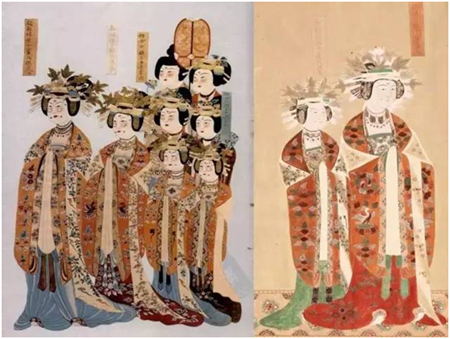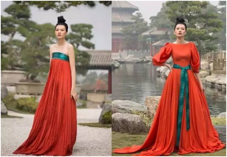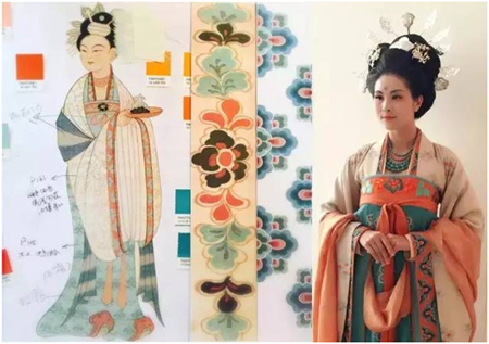 本次作品是以敦煌洞窟唐代壁畫供養人為原型,仿制6套傳統式樣的敦煌唐代女性服飾,盡可能忠實壁畫人物形象原貌,恢復使用傳統染、織、繡等手工技藝 ,再現盛唐時代中國傳統服飾的華麗絢爛的風貌。另外延伸設計創新作品24套,是以敦煌唐代藝術元素作為創作的主題,整體色彩借鑒楚艷近年來整理出的唐代傳統紅色體系,提煉唐代藝術元素,研究探索敦煌唐代元素在現代服飾的創新應用。楚艷老師表示:“研究唐代服飾,基本上一定會做敦煌這方面研究的。”
