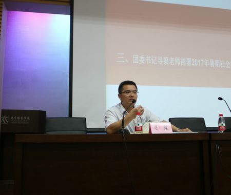 在全體起立合唱國歌后,團委書記尋梁老師首先簡要介紹了2017年學校暑期社會實踐的基本情況,現場部署了今年的實踐工作安排。今年全校一共派出10支社會實踐隊伍,分別奔赴北京、天津、山西、陜西、江蘇、廣東、河南7個省市開展暑期社會實踐活動。按照團中央、教育部、團市委相關通知要求,此次暑期社會實踐活動的總主題是“青年服務國家——投身助力十三五 青春喜迎十九大”,活動將以積極健康、豐富多彩的實踐活動為載體,從中國精神學習宣講、聚焦農村精準扶貧、創新驅動經濟轉型、關注民生志愿公益、社會主義先進文化繁榮發展等方面深入行業和基層,發揚奉獻精神,充分展現當代大學生鍛煉自我、服務社會、甘于奉獻的良好精神風貌。