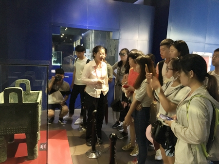 殷墟,一段輝煌的歷史;殷墟,一顆璀璨的明珠。當大家來到殷墟博物苑前,首先映入眼簾的是兩扇紅色的大門,橫梁上赫然寫著“商朝王陵遺址”六個金色的大字,在陽光的映襯下閃閃發光。進入大門,每一個角落都吸引著同學們前去探索。展館里陳列著“殷墟王陵”中做工精巧的生活用品和軍事武器,同學們親眼見到了被稱為“世界青銅器之最”的“后母戊大方鼎”,被先人的精湛工藝深深折服。隨后同學們參觀了華夏最早的巾幗女將“婦好”墓,又走過200米的甲骨長廊,了解到甲骨文的前世今生——那些用于占卜的歷史以及各種各樣有趣的圖案文字。這些都是先人們智慧的結晶。