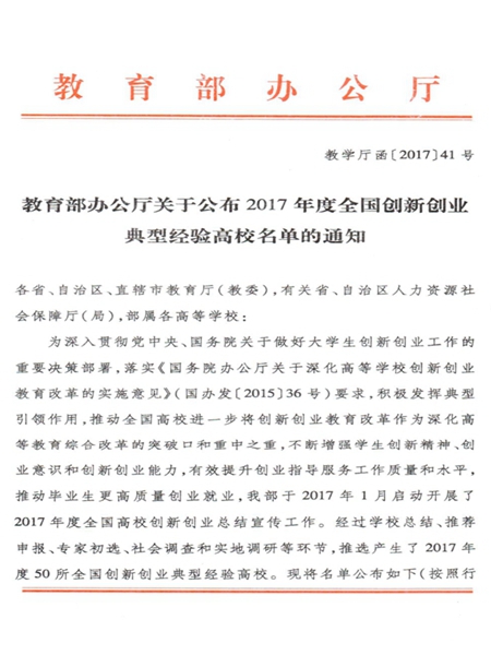 為學習貫徹《國務院辦公廳關于深化高等學校創新創業教育改革的實施意見》要求,推動全國高校進一步將創新創業教育改革作為深化高等教育綜合改革的突破口和重中之重,教育部決定開展全國高校創新創業工作總結宣傳工作,著重總結并宣傳推廣創新創業典型經驗高校在創新創業人才培養、創業指導服務以及高質量創業就業工作方面的典型做法和特色經驗,發揮創新創業典型高校的示范引領作用。2017年1月至5月歷經學校總結、推薦申報、專家初選、社會調查和實地調研等一系列環節,我校從全國132所申報高校中脫穎而出,進入55所實地調研高校。并于今年6月上旬接受教育部專家組實地考察,最終成為2017年度全國50所創新創業典型經驗高校之一。