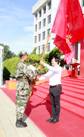 在雄壯的中國人民解放軍軍歌后,副院長賈榮林為參訓營授旗。接下來,李保華團長做開訓動員,他表示,軍訓是對大學生進行愛國教育和國防教育的重要舉措,是每個大學生的必修課,軍訓為以后的學習、生活和工作都奠定了基礎。希望新生們能充分認識到軍訓的重要性,做到一不怕苦二不怕累,以優異的軍訓成績向學校匯報。他鼓勵新生們能認真完成訓練科目,嚴格遵守規章制度,嚴格遵守作息時間,嚴格請銷假制度。