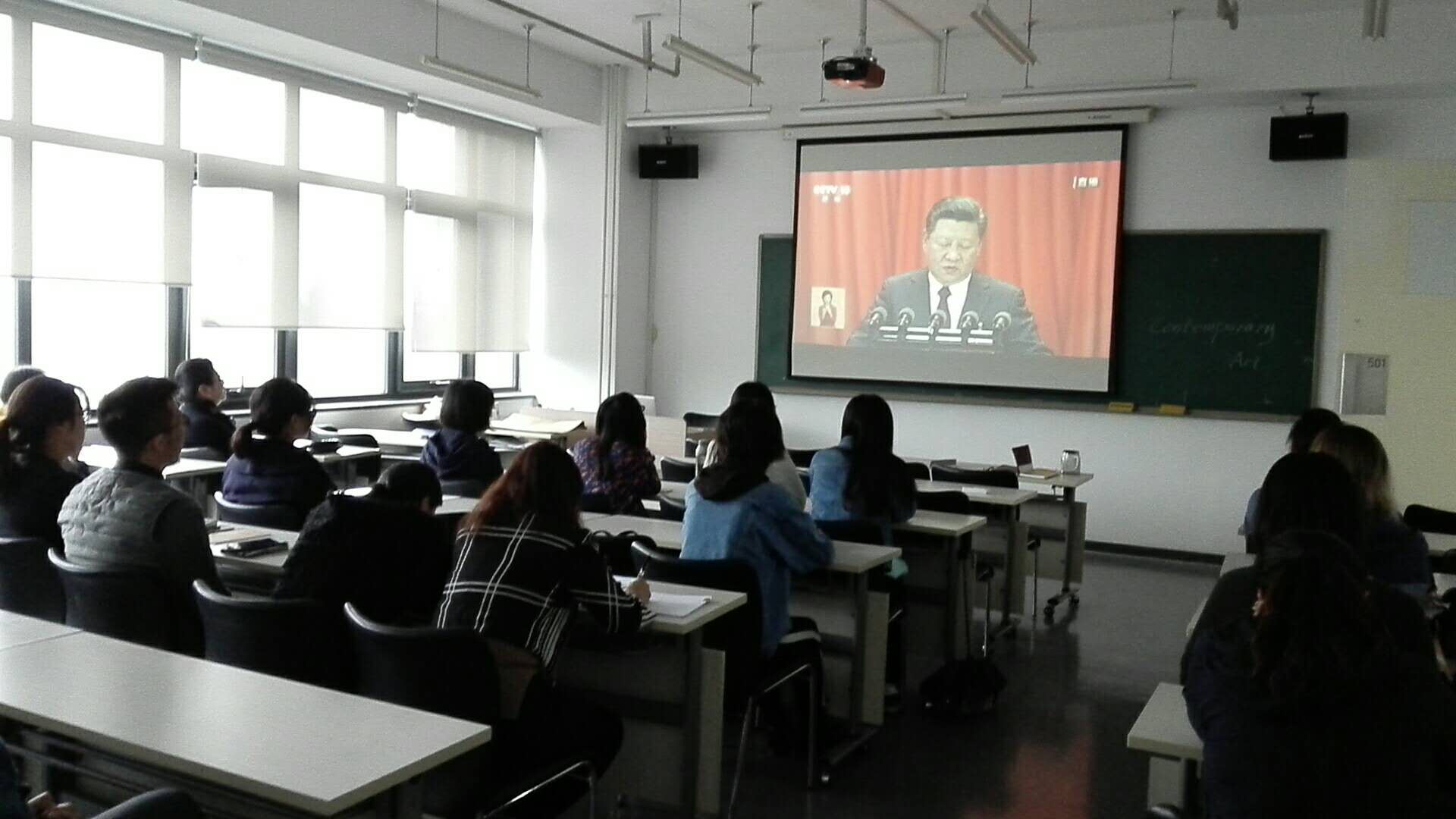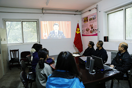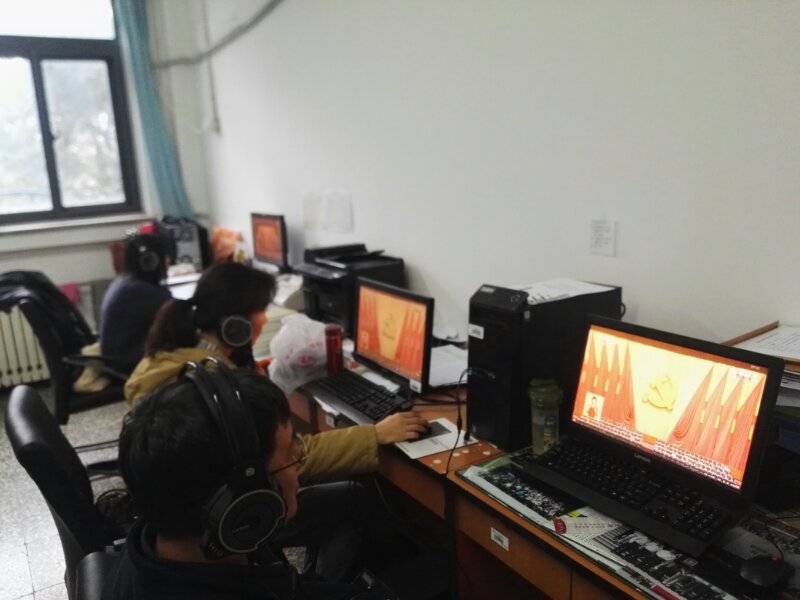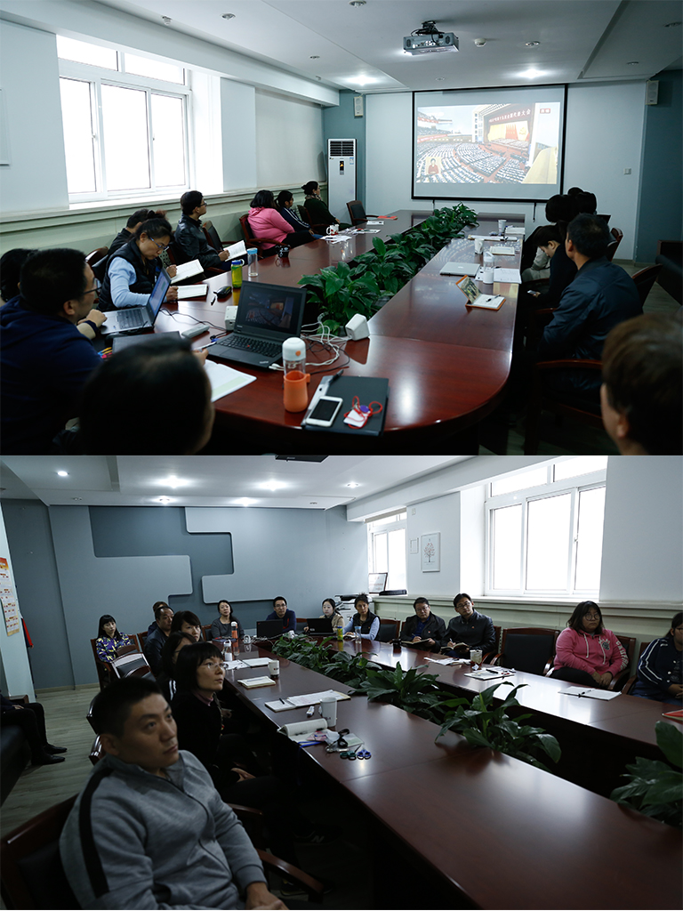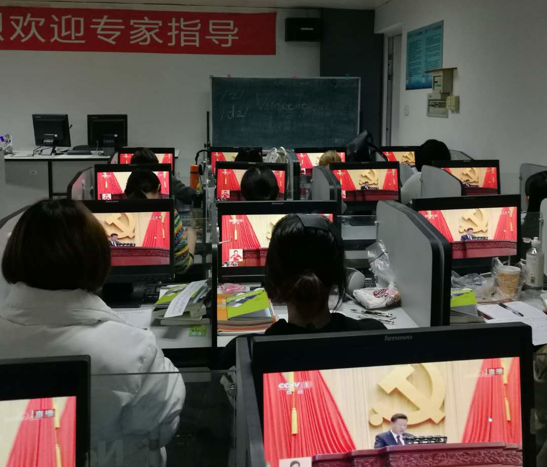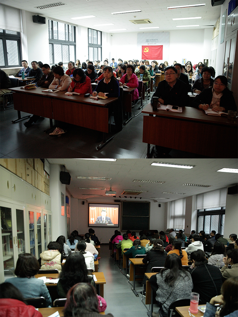 學校黨委理論中心組,機關黨總支、后勤黨總支、離退休黨委、北校區、牡丹園校區及各二級學院、教學部門均在會議室等公共場所組織集中收看。學校官網、各大屏幕、電視、宣傳欄等宣傳陣地也都對大會進行同步直播,或顯示出“喜迎十九大”等字樣,全校上下以最熱情的方式慶祝黨的十九大勝利召開!