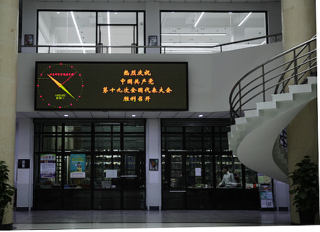 圖書館電子屏顯示“熱烈慶祝中國共產黨第十九次全國代表大會勝利召開”字樣